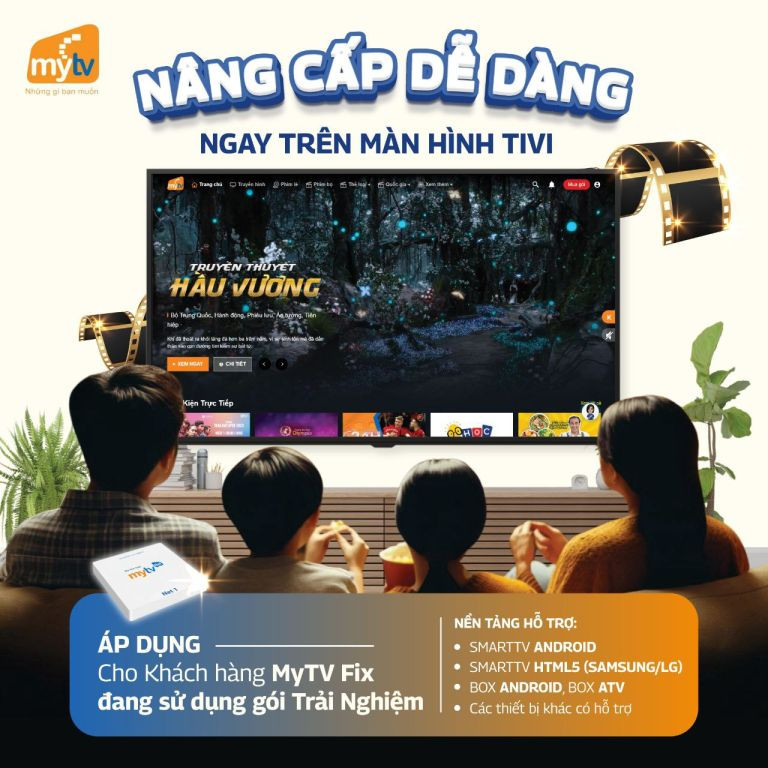 Cụ thể, đối với tất cả các thuê bao MyTV Fix đang sử dụng gói Trải Nghiệm trên toàn quốc có thể thực hiện nâng cấp/mua lên gói cước (MyTV Nâng Cao Plus) theo hình thức đóng trước cước tương ứng thời gian sử dụng dịch vụ trên màn hình giao diện ti-vi và sử dụng ngay được dịch vụ. Tính năng sẽ được hỗ trợ trên các nền tảng: