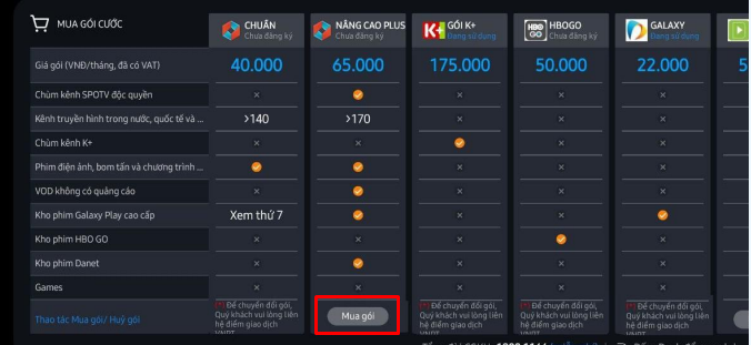 Bước 1: Tại màn hình Trang Chủ ứng dụng MyTV Fix trên SmartTV, vào mục Cài Đặt > Mua Gói > bấm vào nút “Mua gói” Nâng Cao Plus.